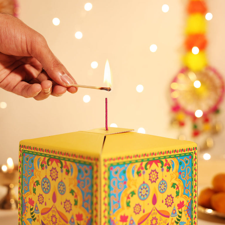 Introducing India’s First Patakha Box — a one-of-a-kind festive surprise that looks like a cracker but opens up as a magical hamper. It’s designed to give you the joy of lighting something special without any noise, or pollution.Celebrate Ayodhya’s spirit of Diwali with a thoughtfully curated hamper that includes:Miniature Ram MandirRam Charan idolLaddoo CandlesA beautiful Greeting CardDesigner Colorful DiyaHow It Works :The Patakha Box is simple and safe to use:Light the wick or pull it gently.Watch the box unfold in a magical way.Experience the joy of festive unboxing with none of the mess or worry.Specifications-Size of the box: 14 cm X 14 cm X 14 cm
