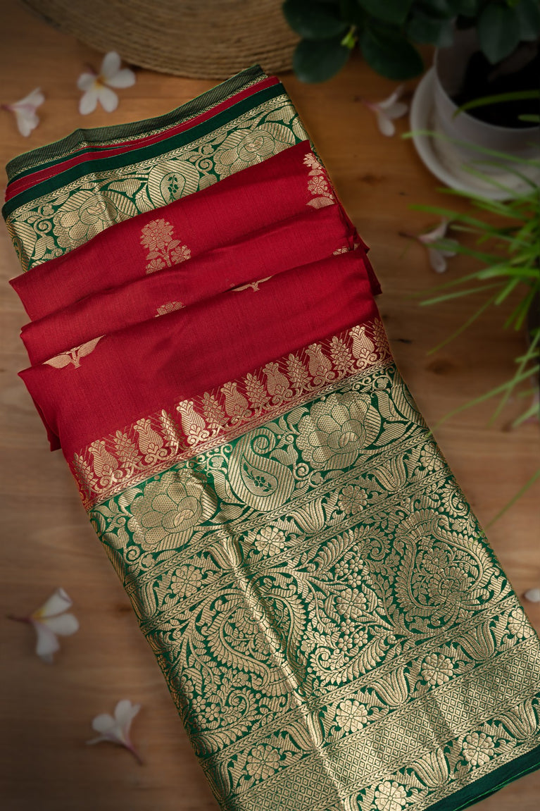 Mandir Red & Dark Olive Green Kuppadam Buttis Saree