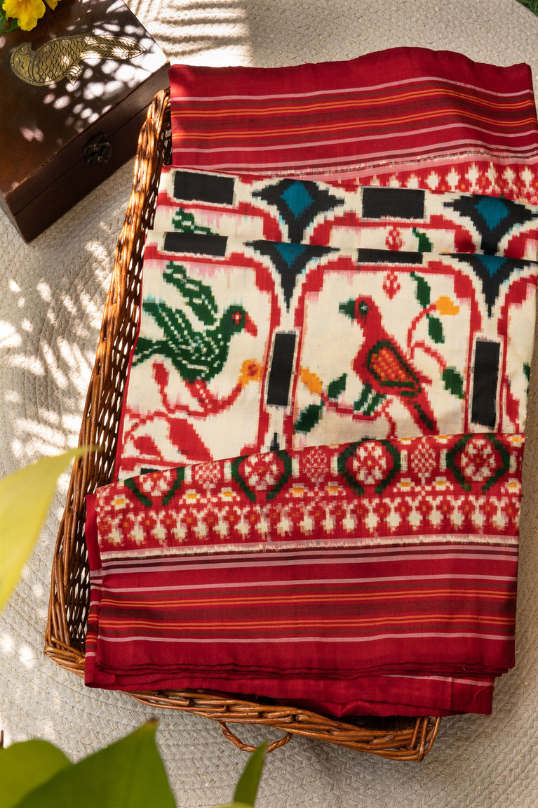 Mandir White & Red Ikat Checks Saree