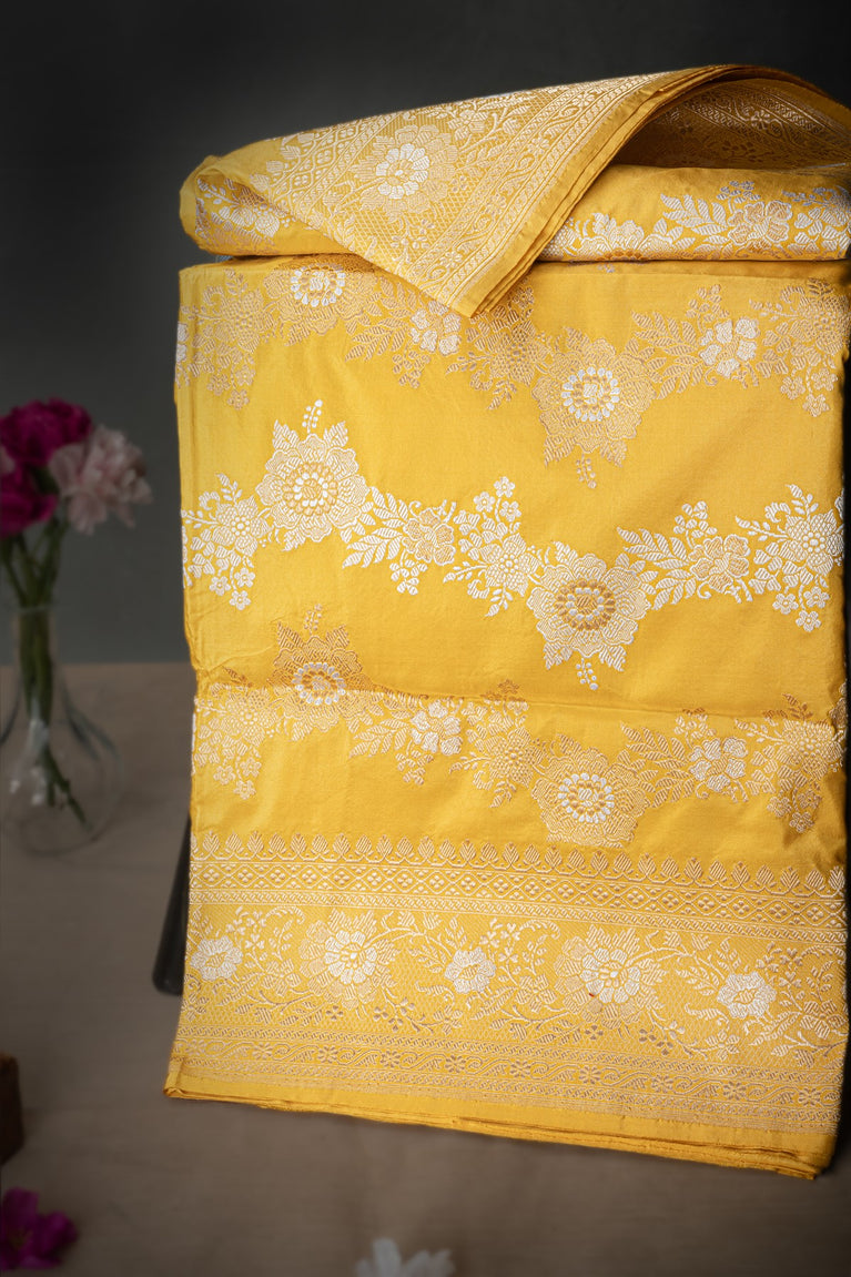 Mandir Yellow & Silver Banarasi Jaal Saree