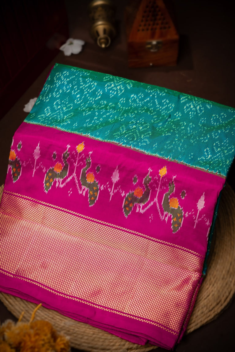Mandir Teal & Magenta Kanchi Ikat Ikat Saree