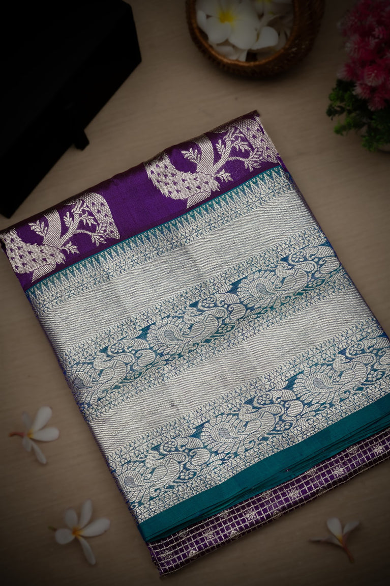 Mandir Violet & Silver Venkatagiri Checks Saree