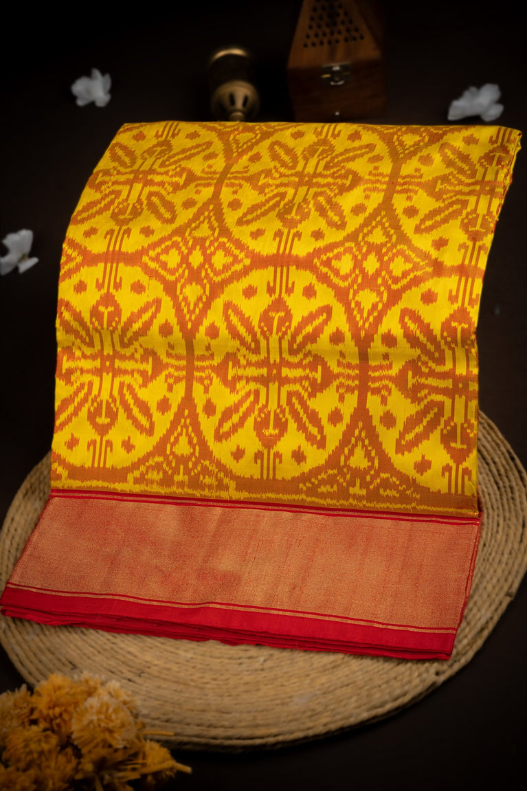 Mandir Yellow & Maroon Ikat Ikat Saree