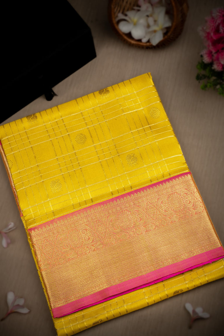 Mandir Yellow & Pink Venkatagiri Checks And Buttis Saree