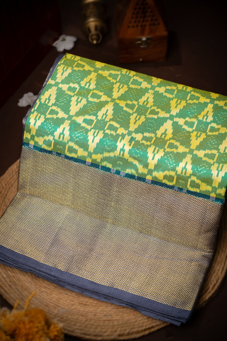 Mandir Lemon Yellow and Green & Red Ikat Ikat Saree
