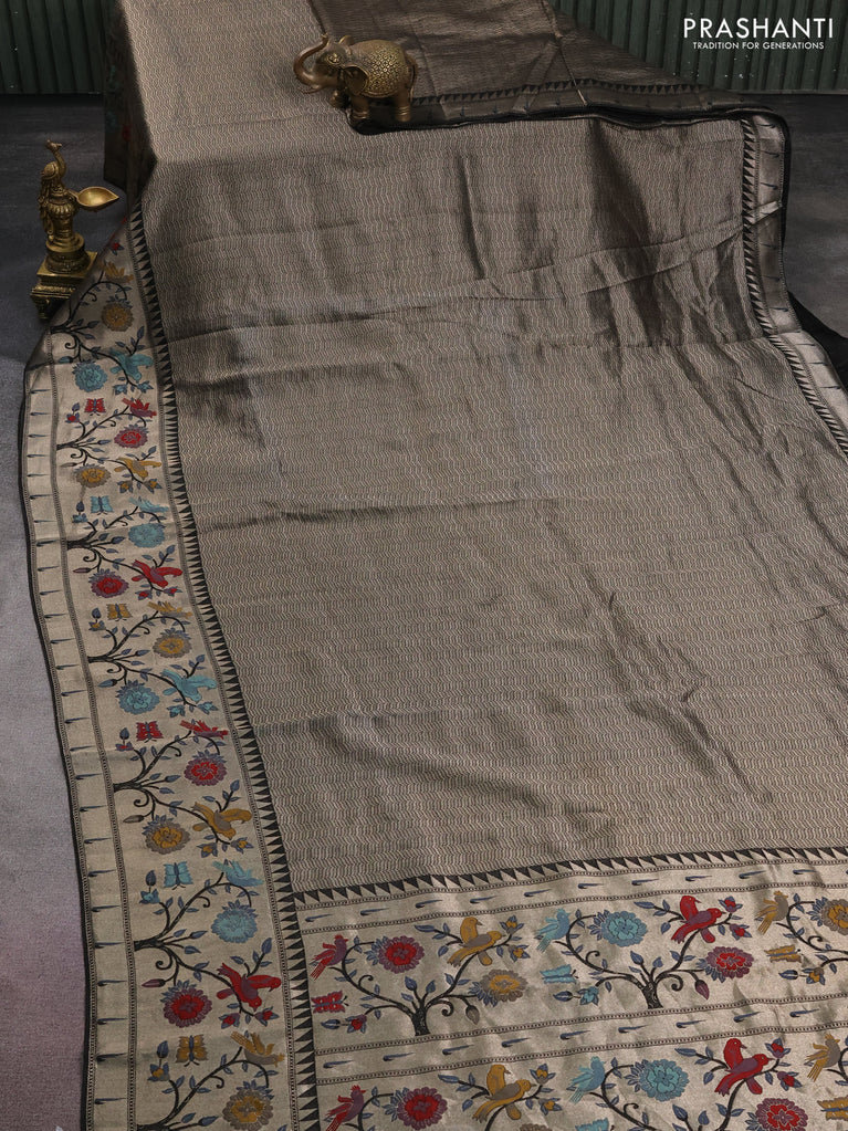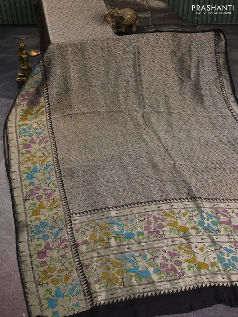 Banarasi semi raw silk saree black with allover silver zari woven paithani weaves and silver zari woven border