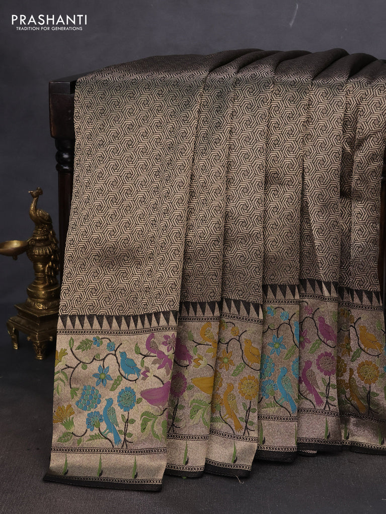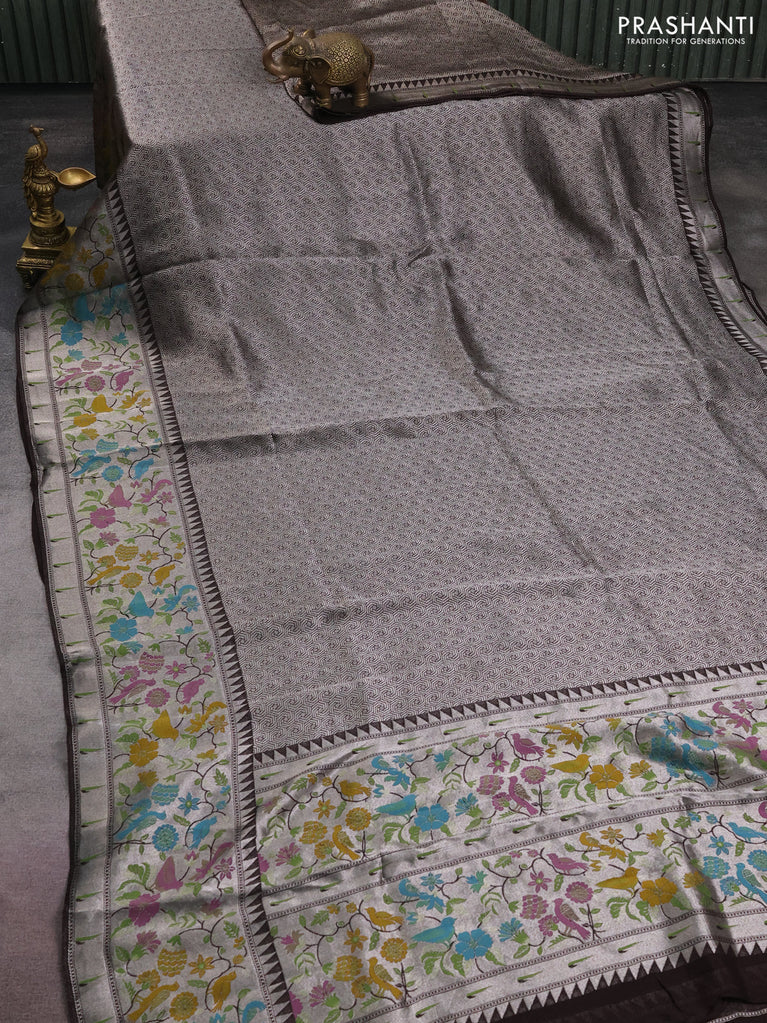Banarasi semi raw silk saree coffee brown with allover silver zari woven paithani weaves and silver zari woven border