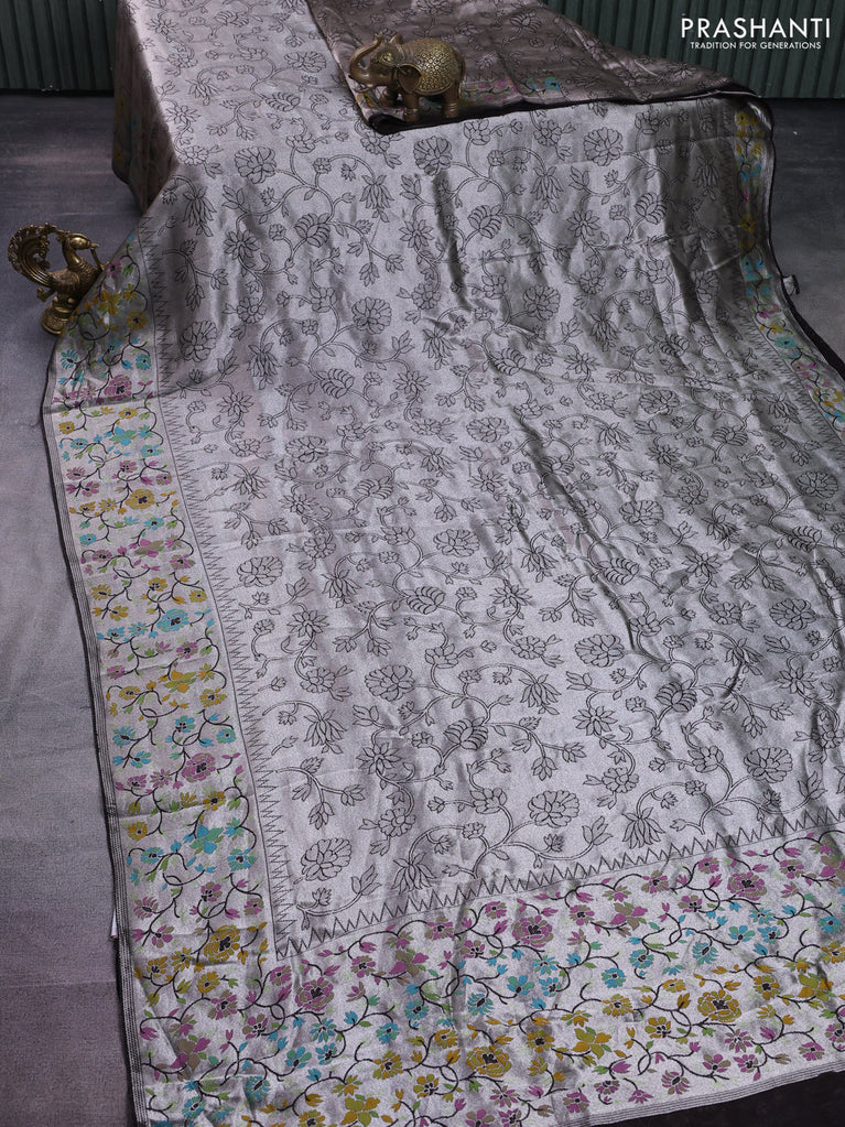 Banarasi semi raw silk saree coffee brown with allover silver zari woven floral weaves and floral design paithani border