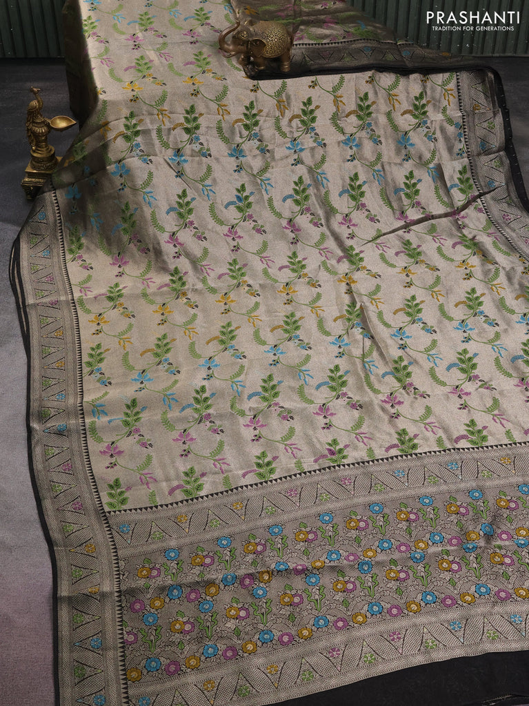 Banarasi semi raw silk saree black with allover silver woven brocade weaves and floral design paithani border