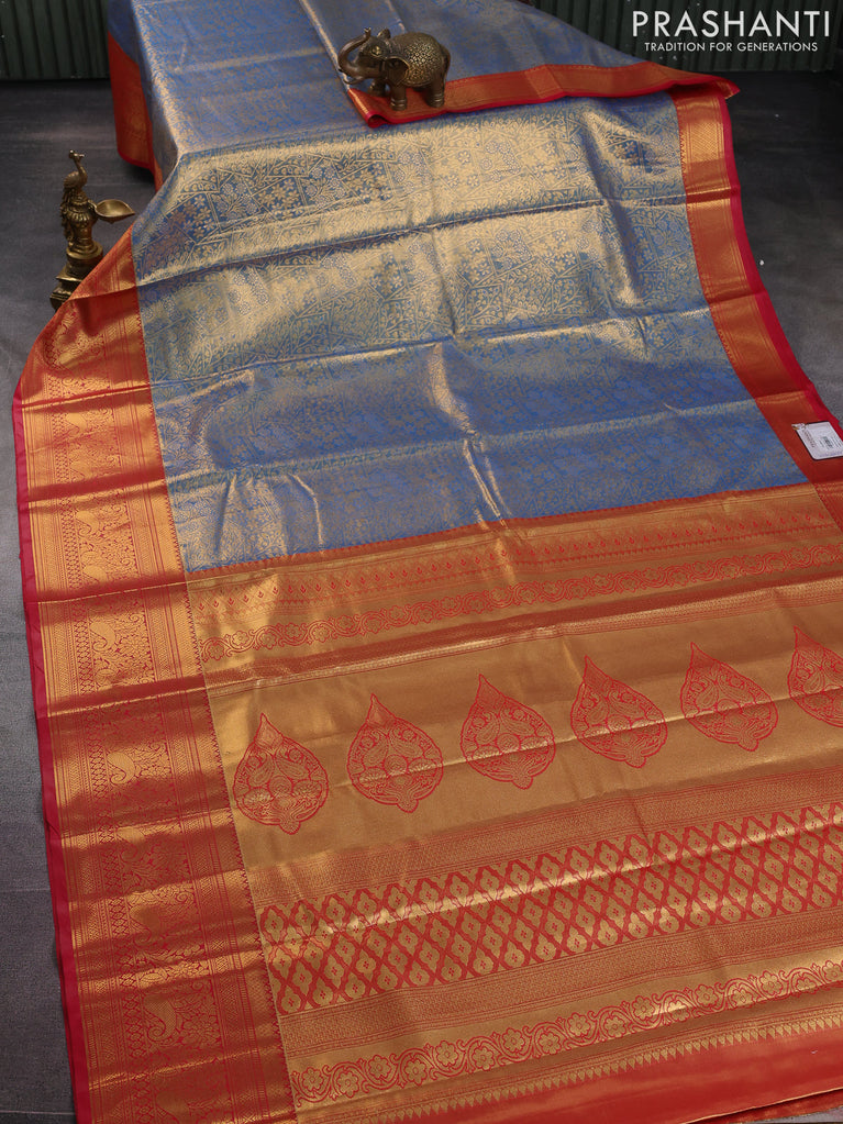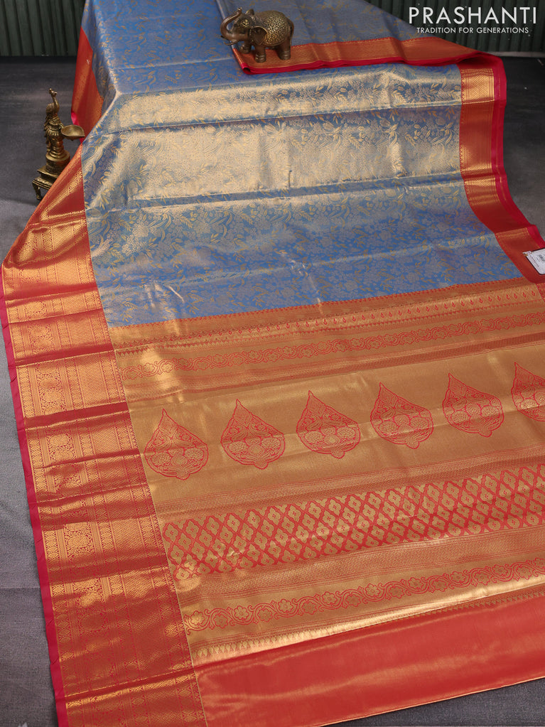 Bangalori tissue silk saree blue and red with allover zari woven brocade weaves and long zari woven border