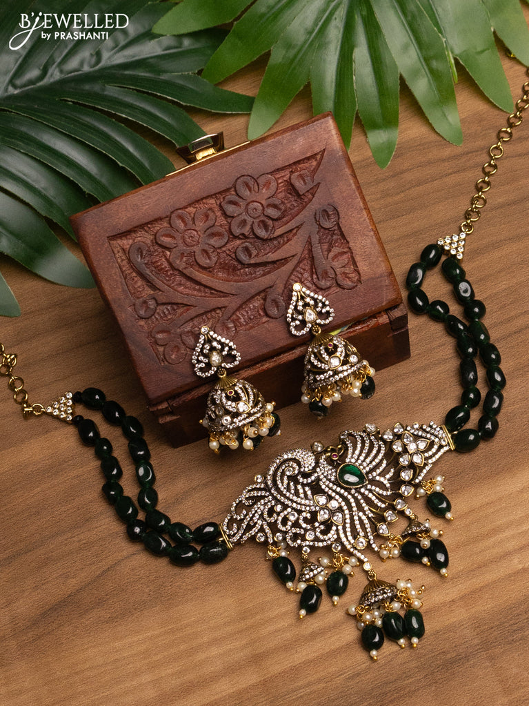 Beaded green choker peacock design with emerald & cz stones and beads hanging in victorian finish