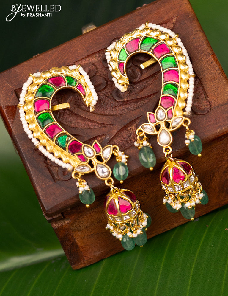 Antique earcuff jhumka peacock design with green jadau kundan stones and pearl hangings