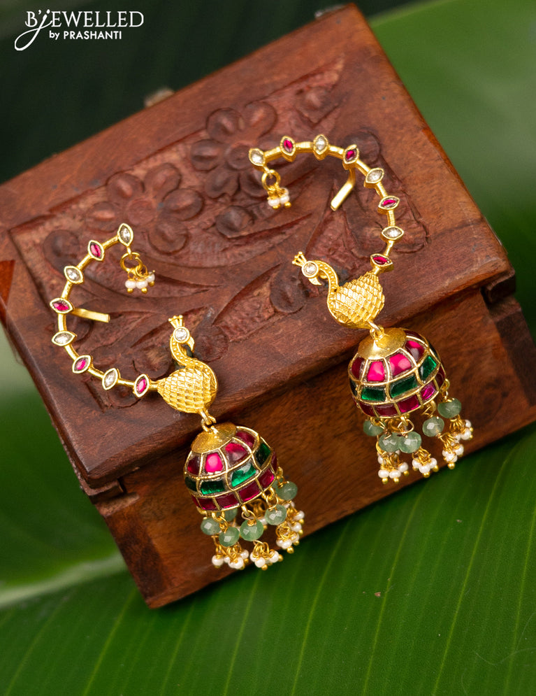 Antique earcuff jhumka peacock design with green kemp & cz stones and pearl hangings