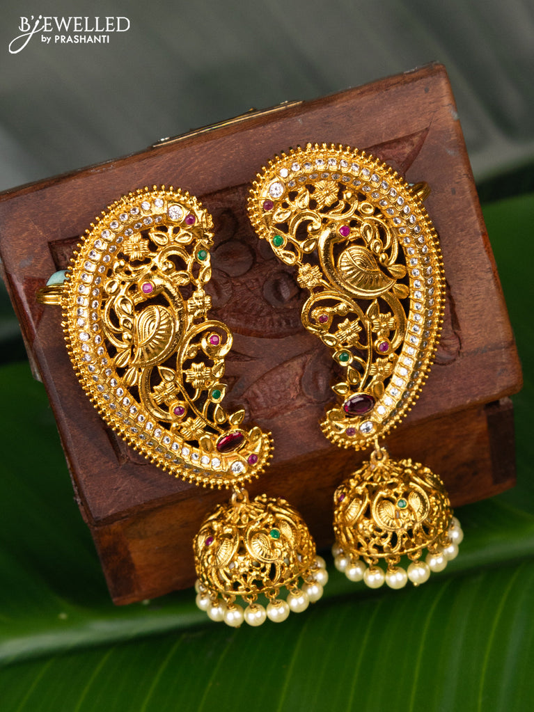 Antique earcuff jhumka peacock design with kemp & cz stones and pearl hangings