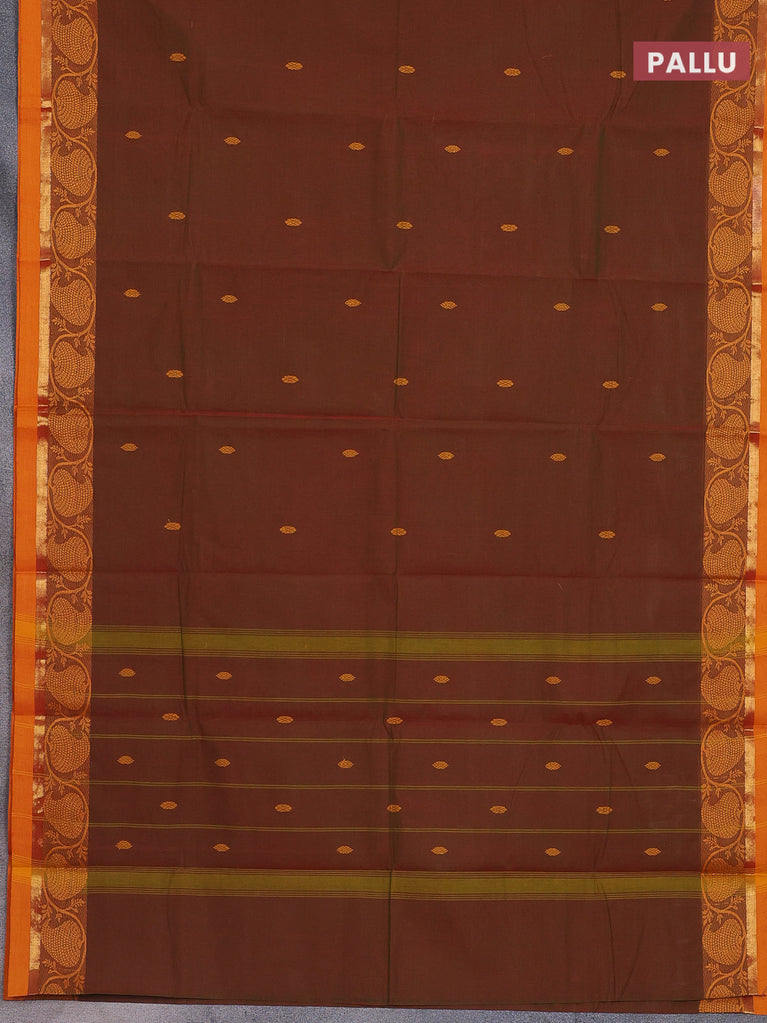 Chettinad cotton saree lime green and orange with thread woven buttas and long zari woven border