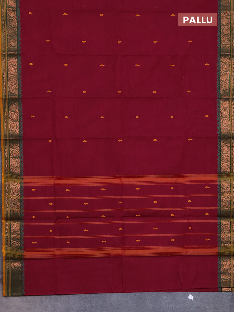 Chettinad cotton saree manthulir green and dark magenta pink with thread woven buttas and zari woven border