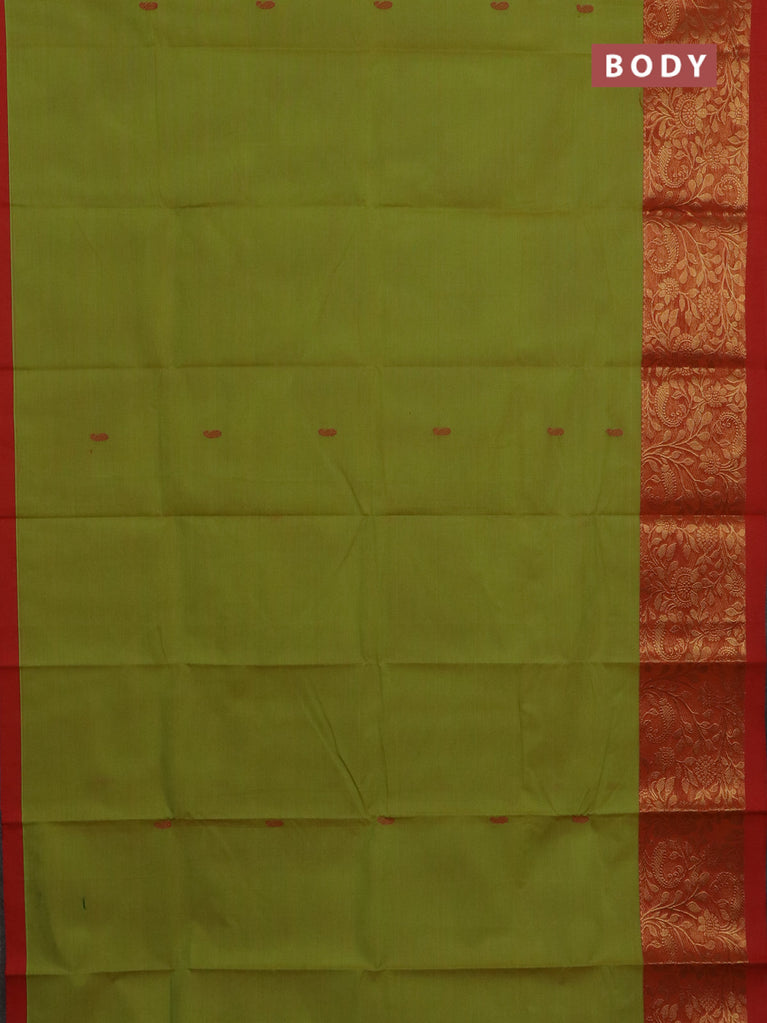 Chettinad cotton saree lime green and red with thread woven buttas and zari woven border
