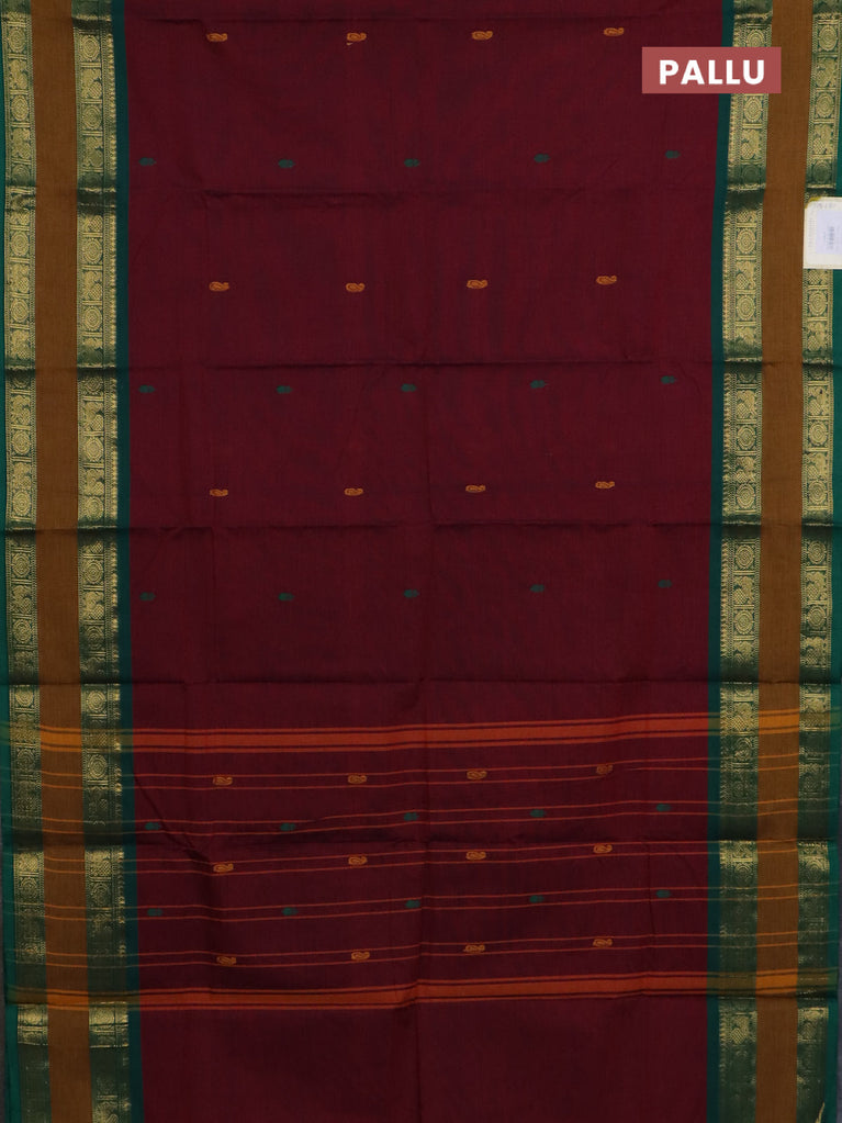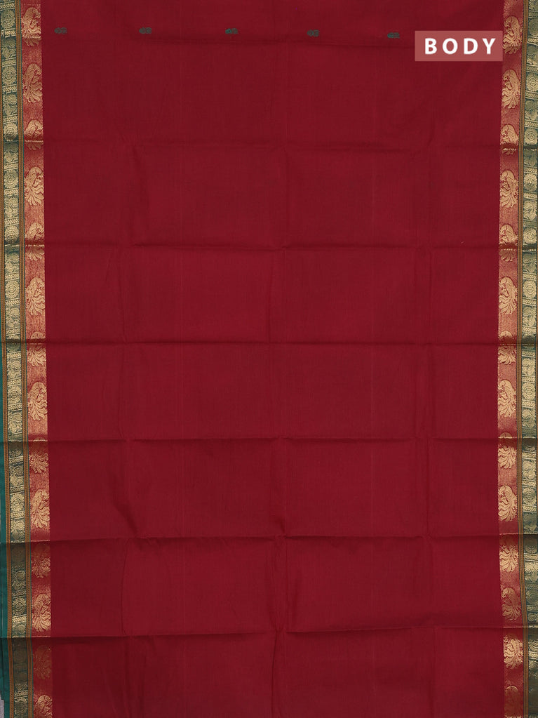 Chettinad cotton saree maroon and green with thread woven buttas and zari woven border