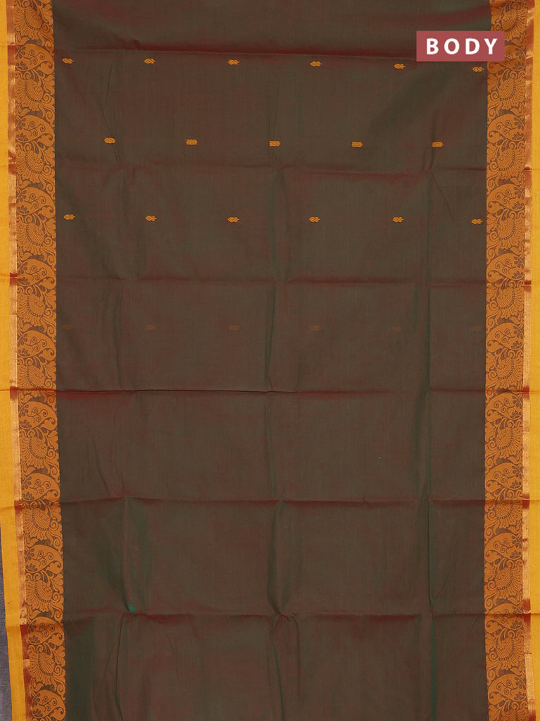 Chettinad cotton saree manthulir green and mustard yellow with thread woven buttas and thread woven border