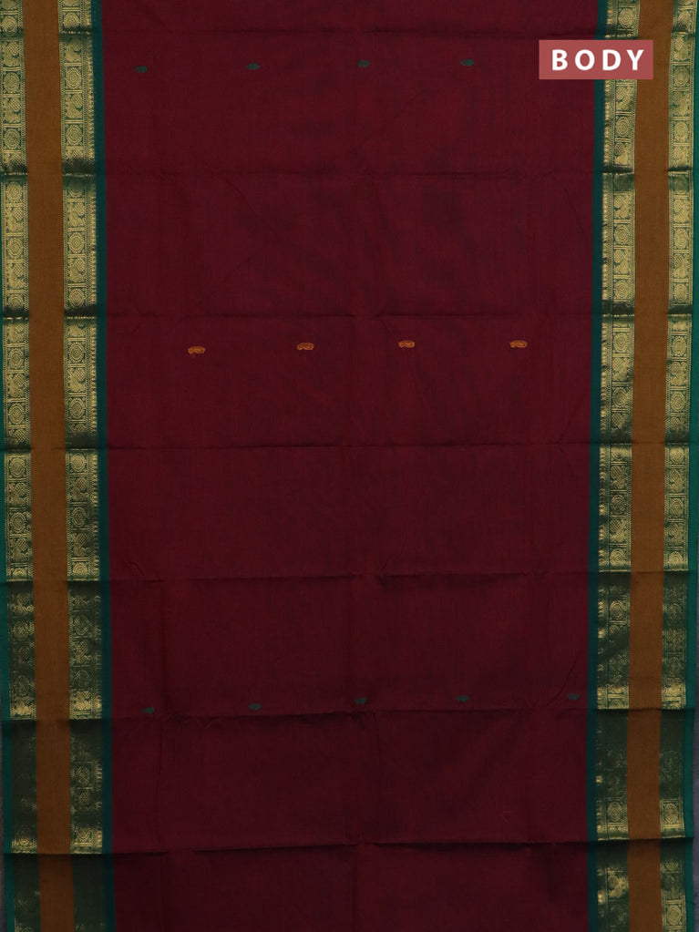 Chettinad cotton saree maroon and green with thread woven buttas and thread woven border