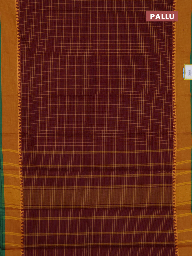 Chettinad cotton saree maroon shade and mustard yellow with allover checked pattern and temple design border