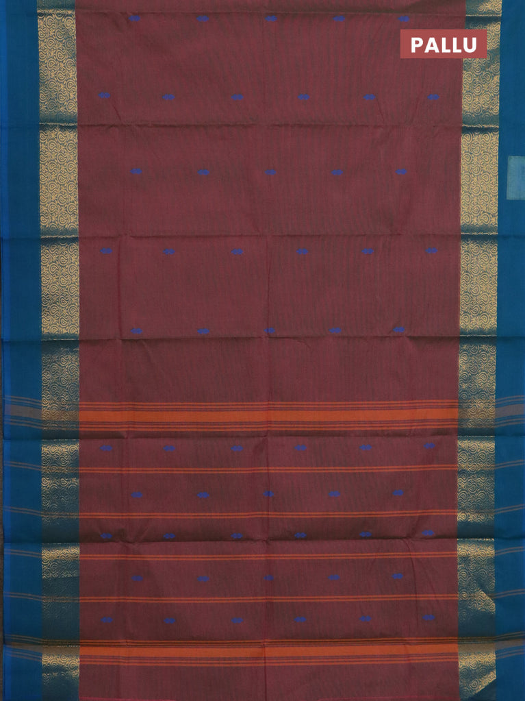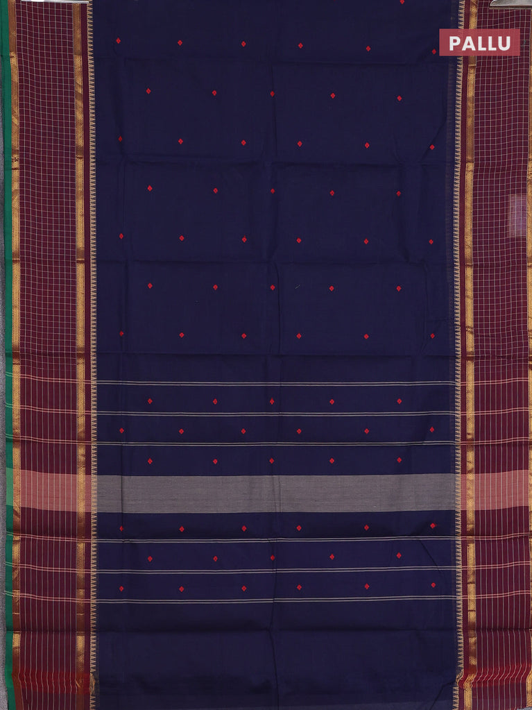 Chettinad cotton saree navy blue and deep maroon with thread woven buttas and zari woven checked border
