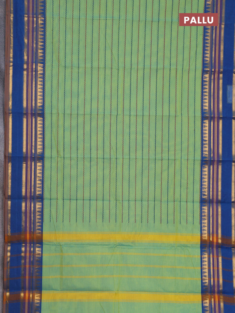 Chettinad cotton saree pastel green and cs blue with allover thread woven stripes pattern and zari woven border