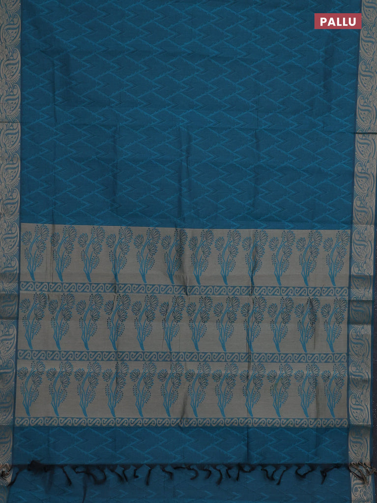 Coimbatore cotton saree peacock blue and sandal with allover self emboss and thread woven border