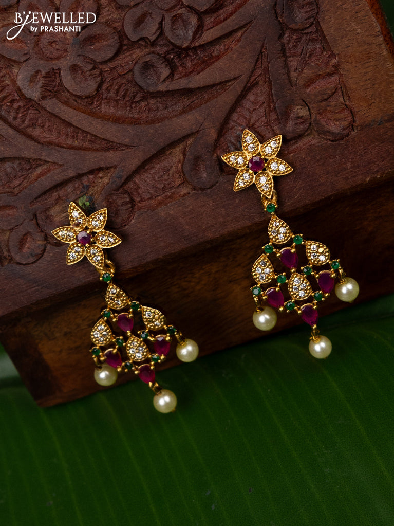 Antique earring with pink kemp & cz stones and golden beads hanging
