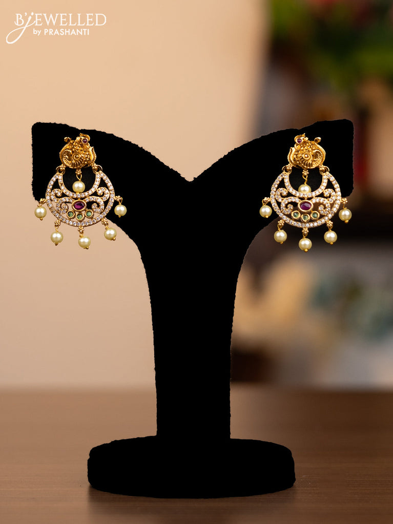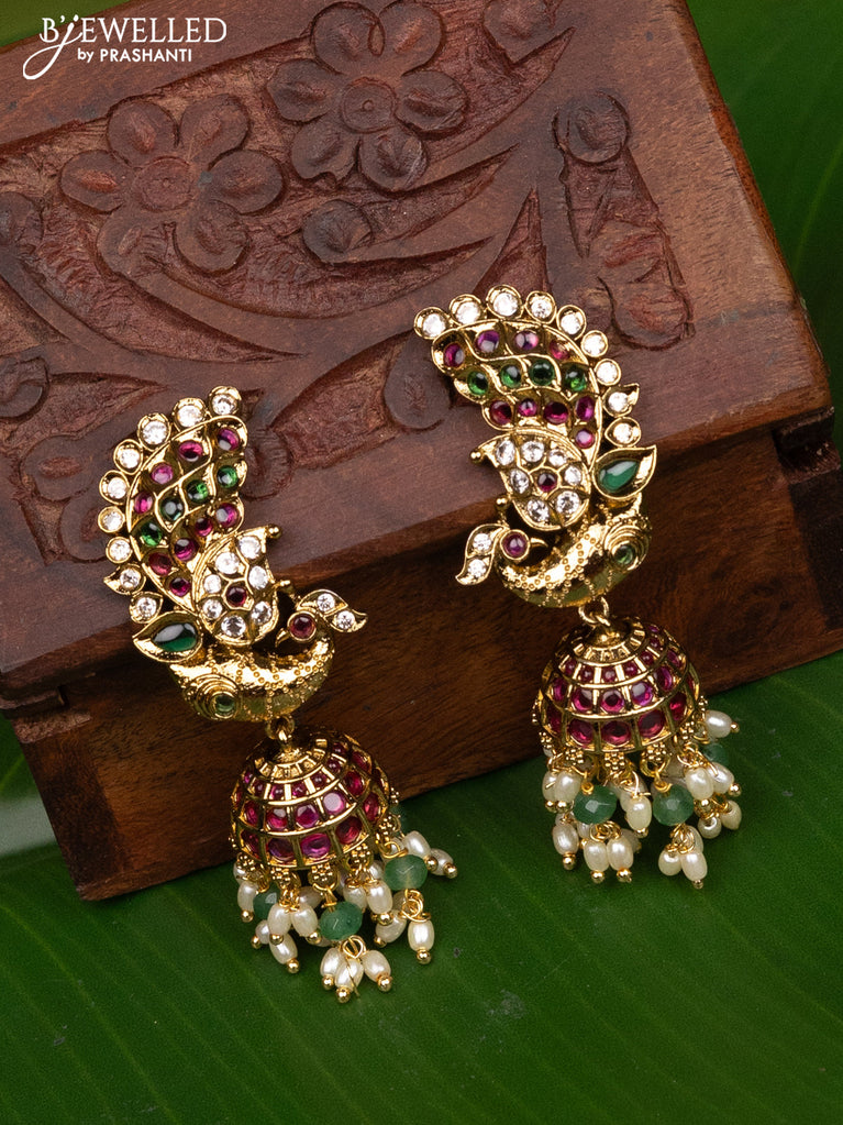 Antique medium size jhumka peacock design with kemp & cz stones and pearl hangings