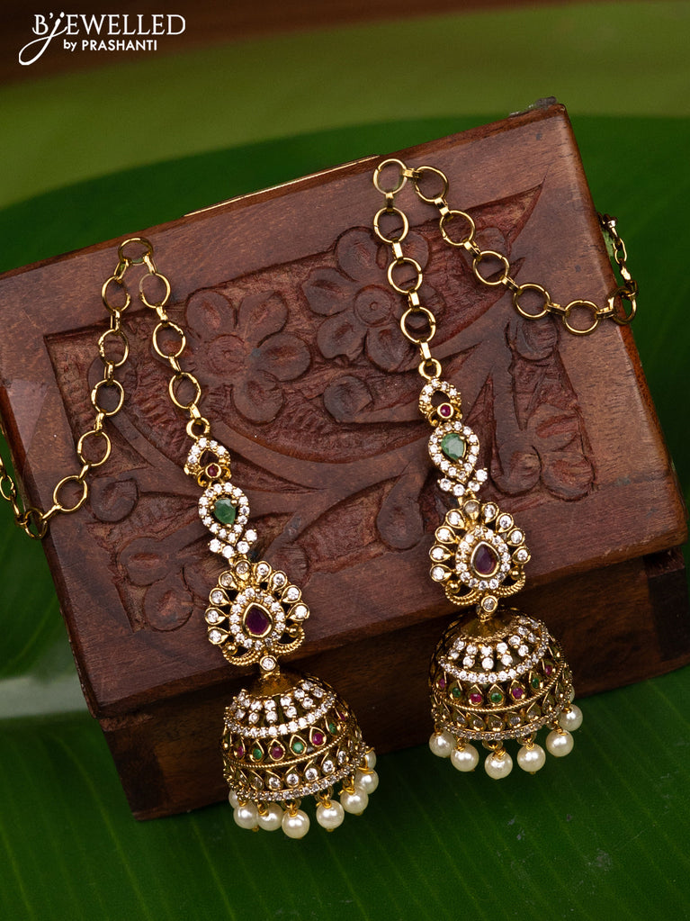 Antique medium size jhumka with kemp & cz stones and pearl hangings
