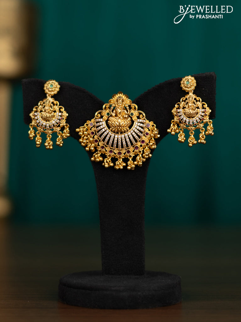 Antique pendant set lakshmi design with kemp & cz stones pearl hangings