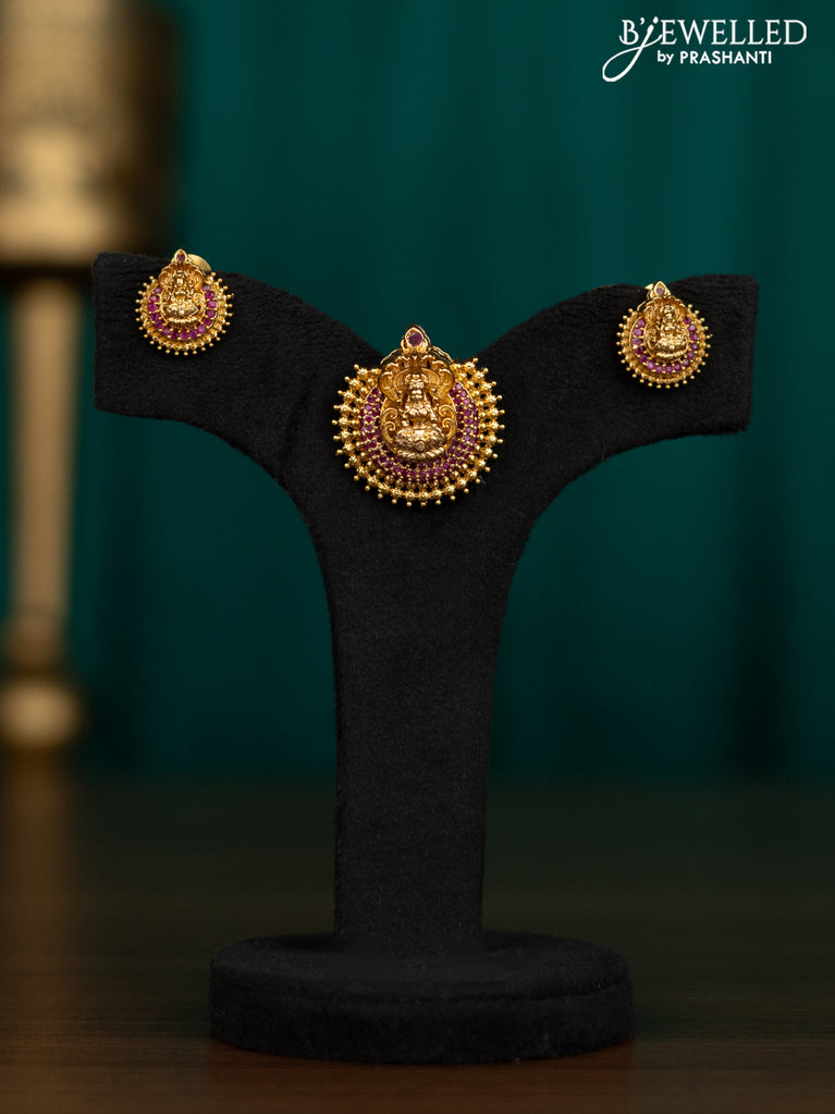 Antique pendant set lakshmi design with pink kemp stones and golden beads hanging