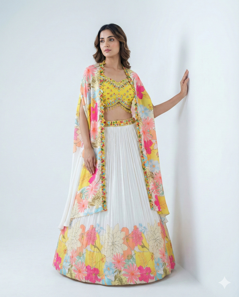 Colorful Chinnon Lehenga with Heavy Sequin Work & Yellow Contrast Blouse with Printed Cape
