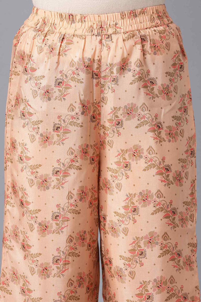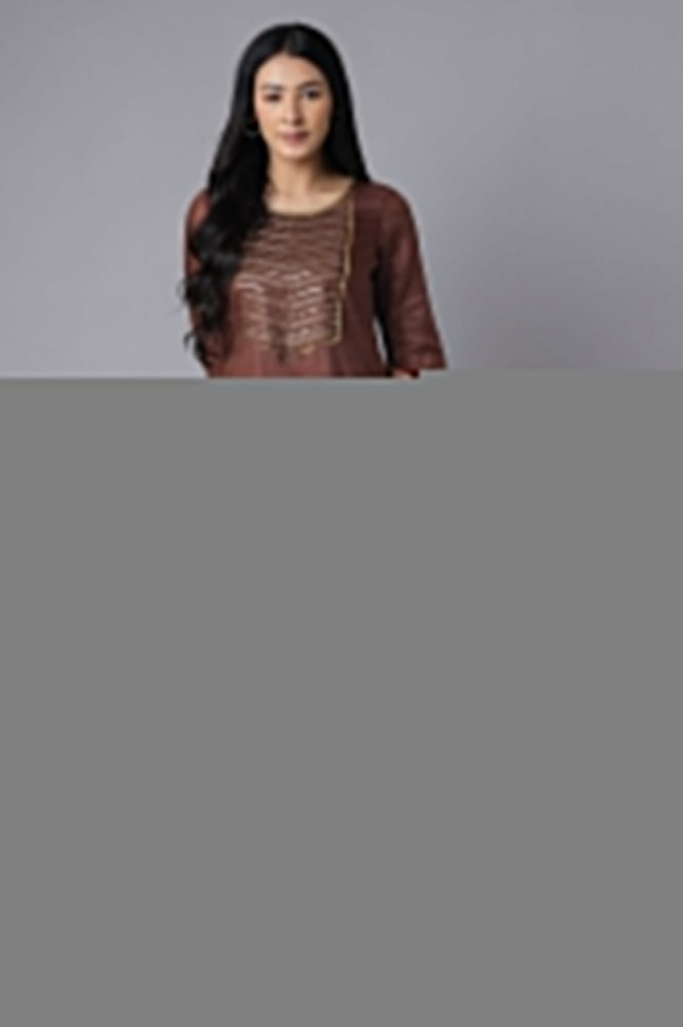 Make a sweeping entrance in this rich dark brown shantung kurta and culottes set to reinvigorate your wardrobe and mood. The kurta is adorned with zari embroidery and sequin work on yoke and sleeves hem. Coordinated with peach flared culottes in floral print and has mid-rise and partially elasticated waistband.