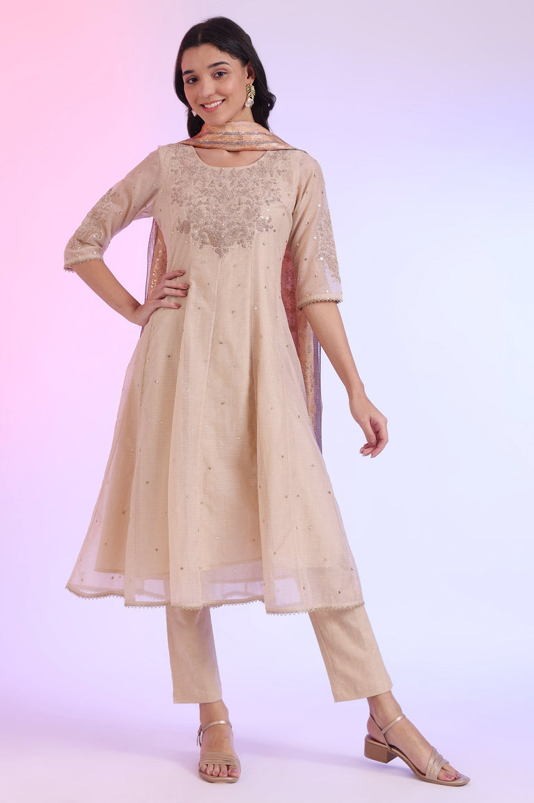 Elevate your special occasions with this exquisite ethnic set from Aurelia. Crafted from 100% polyester, this woven ensemble features a round neckline and three-quarter sleeves, perfect for a fusion look. The natural-colored set is adorned with intricate dori embroidery and foil detailing, adding a touch of glamour. The flared anarkali silhouette is complemented by trousers and a dupatta, creating a complete and elegant outfit. Hand-wash recommended to maintain its beauty. This women's ethnic set is designed to make you stand out at any special event with its unique blend of traditional and contemporary elements.