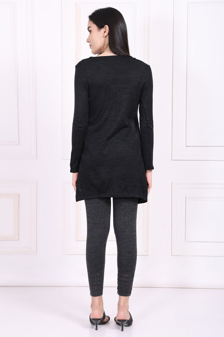 A whisper of winter elegance defines this beautiful kurta for women, presented in a rich Charcoal Heather shade. This apparel is thoughtfully designed to offer both exceptional warmth and sophisticated style, making it an essential addition to your cold-weather wardrobe. The absolute highlight is the stunning and intricate floral ornamentation that gracefully adorns the yoke, creating a beautiful frame around the chic keyhole neckline. Its flattering A-line silhouette flows effortlessly from the shoulders, creating a graceful shape that complements various body types. The full-length sleeves provide ample coverage and warmth, ensuring you stay cozy through the day's engagements. Crafted from a wonderfully soft and entirely opaque fabric, this ethnic tunic moves with you, promising complete comfort without any hint of transparency. The hemline is clean and subtly flared, enhancing the garment’s graceful drape and movement. This single-piece apparel is perfect for those seeking an impeccable blend of traditional craftsmanship and contemporary design. You'll find yourself reaching for this versatile embroidered A-line kurti for everything from casual brunches and workdays to quiet festive evenings. It's a timeless statement of refined taste, promising to be a cherished piece for seasons to come.