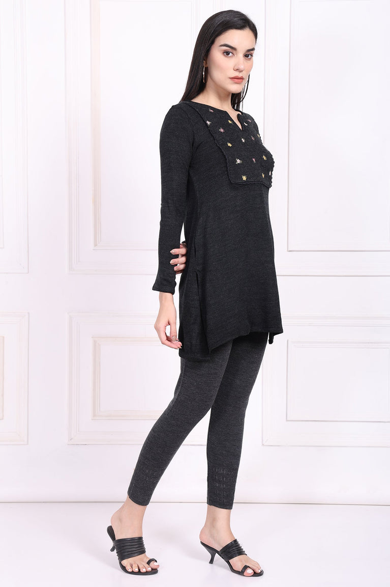 Cozy sophistication defined, this charming tunic is a testament to understated winter style. It’s the perfect kurti for women seeking both warmth and elegance, designed to glide effortlessly from a casual day out to a relaxed evening gathering. The silhouette is a classic straight cut, crafted in a deep charcoal grey hue that offers endless pairing possibilities and flatters every form. Your eyes are drawn to the tastefully designed yoke, which showcases delicate multi-colored floral embroidery, a garden of subtle color against the rich backdrop, all framed by a chic scalloped trim. It features a flattering notched V-neckline that adds a touch of modern grace, complemented by full-length sleeves for complete comfort. The fabric feels wonderfully soft and warm against the skin, ensuring you stay snug without an ounce of sacrificed style. This completely opaque winter tunic falls to a straight hemline finished with functional side slits, enhancing movement and adding to its relaxed feel. We’ve even included discreet side pockets for your essentials. You'll find this beautiful grey embroidered kurti becomes an indispensable part of your cold-weather collection, effortlessly blending traditional motifs with contemporary comfort in one stunning piece of apparel.