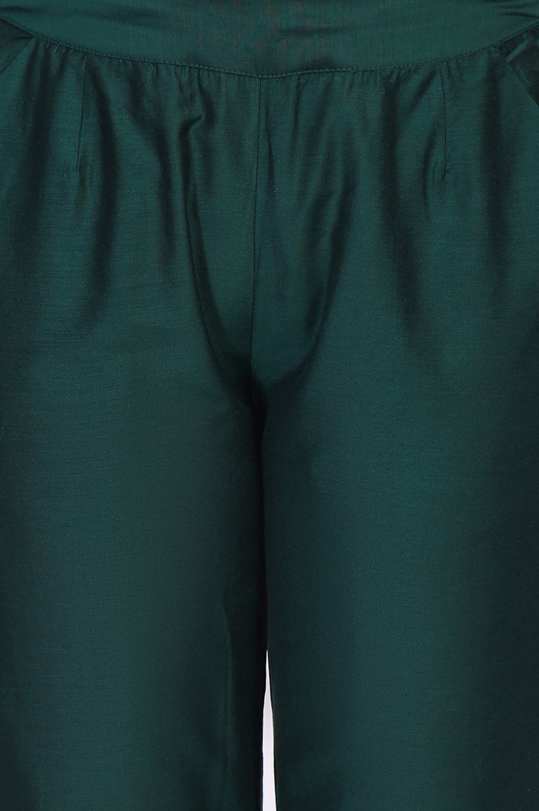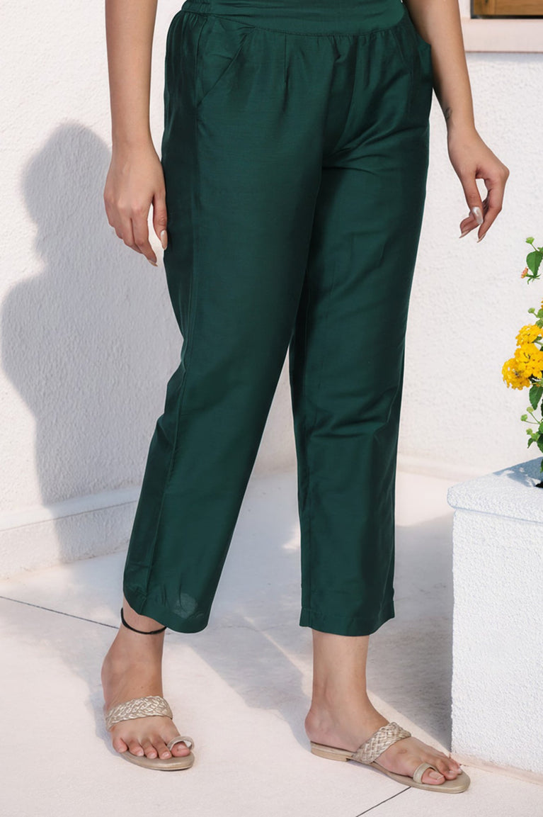 The fit that moves the way you do—these straight-leg trousers in a captivating Deep Forest Green are a masterclass in versatile design. As essential ladies' trousers for modern wardrobes, they bridge the gap between relaxed comfort and polished style. The silhouette is impeccably straight, creating a clean line from hip to hem that finishes at a contemporary ankle length. Experience true ease with the convenient pull-on design, featuring a fully elasticated waistband that sits comfortably at a mid-rise. This thoughtful construction eliminates fussy closures while maintaining a smooth, flattering front. Practicality is woven into the design with two functional slant pockets that blend seamlessly into the side seams, offering space for your essentials without disrupting the sleek profile. The front style is beautifully flat, allowing the rich, solid color and fluid drape of the fabric to take center stage. Crafted from a material chosen for its soft touch and graceful movement, these pants feel as good as they look. Whether you're creating an elegant ensemble with a silk top or seeking the perfect women's pants to pair with your favorite kurta, this pair promises endless styling possibilities and uncompromising comfort from morning to night. The stitched hem ensures a durable and refined finish to this wardrobe staple.