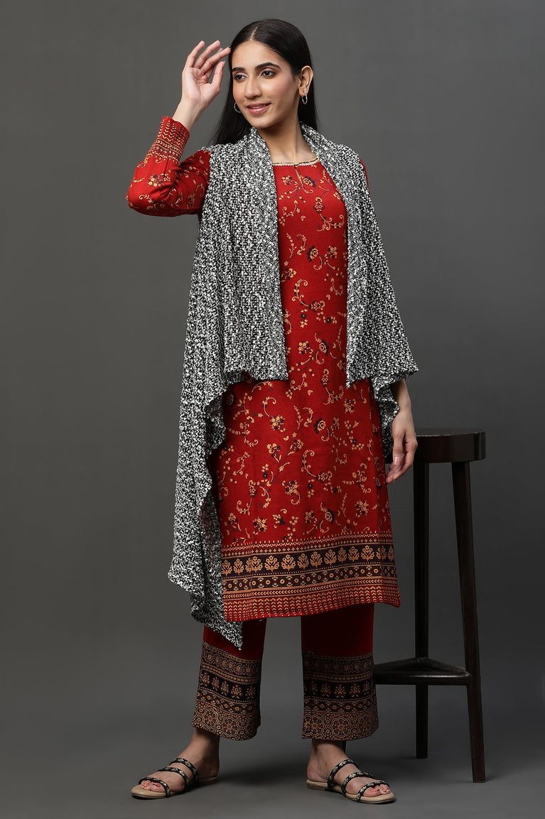 Amp up your look with this pretty black and white checker kurta set. The set A-line kurta with braided white belt and has round neckline. It is paired with black solid tights.