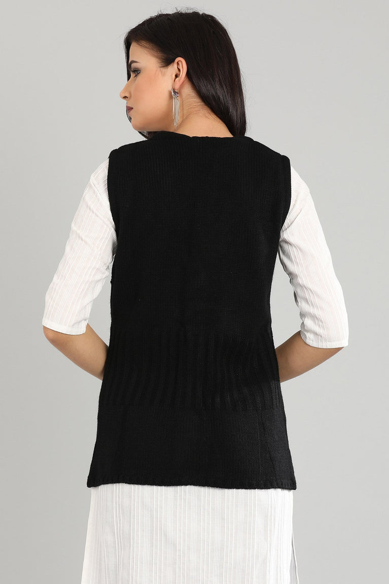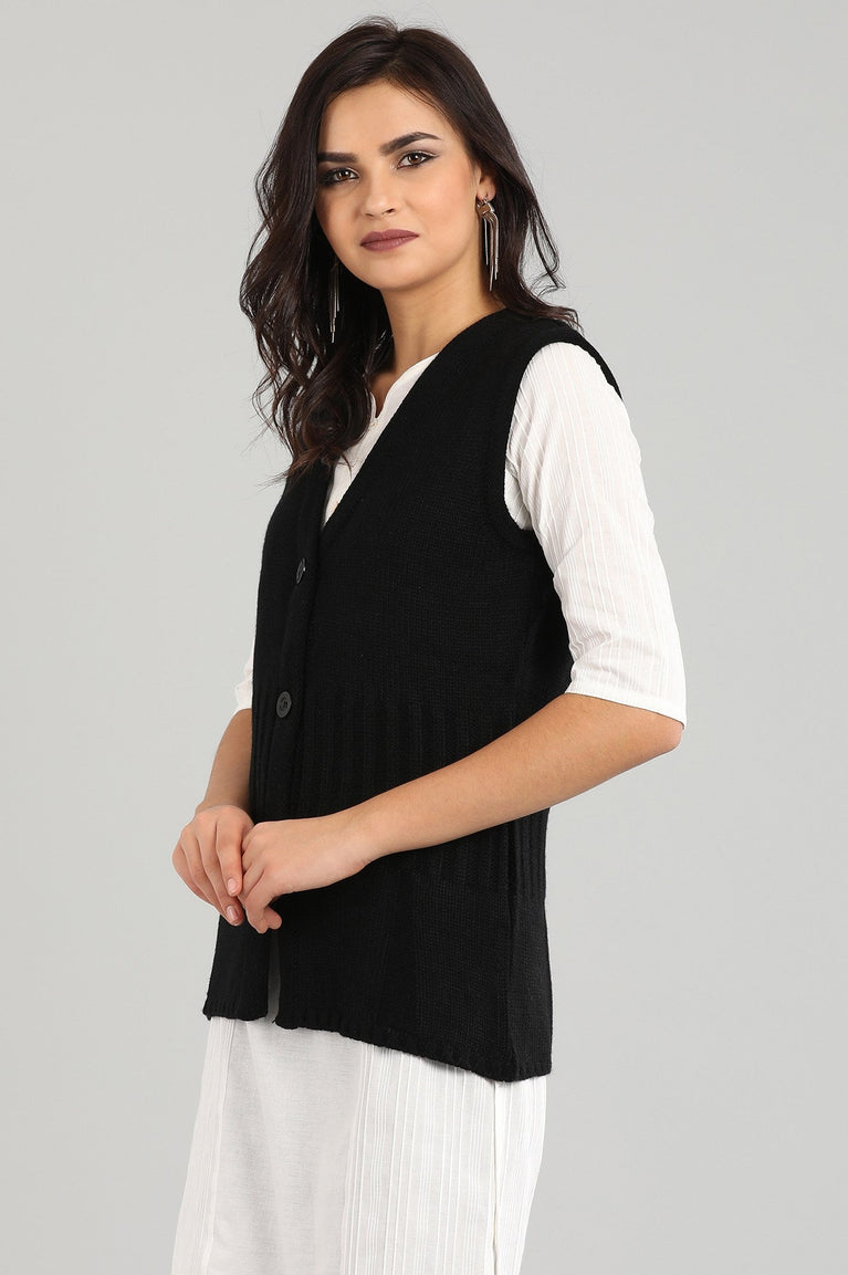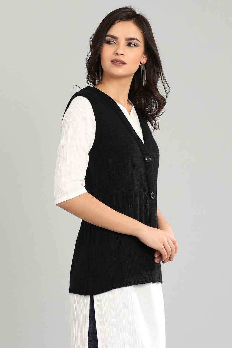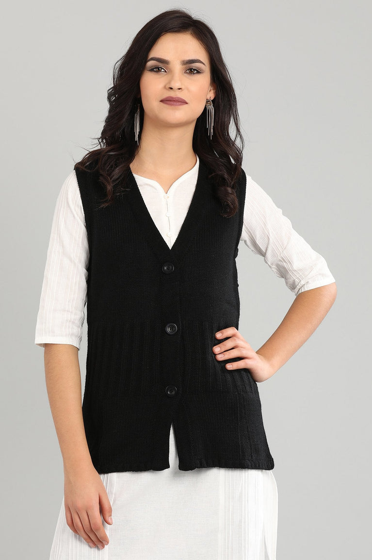 Black V-neck full sleeve self-designed sweater with button closure on the front.