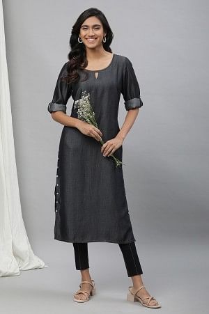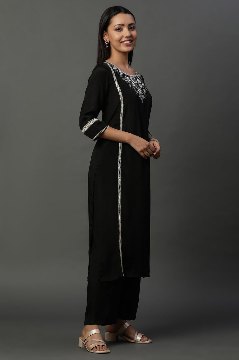 Black Viscose Tissue Straight Kurta with Embellished Neckline