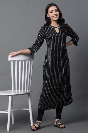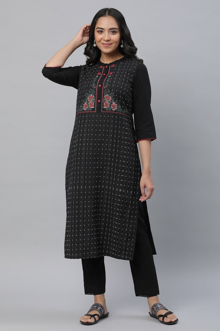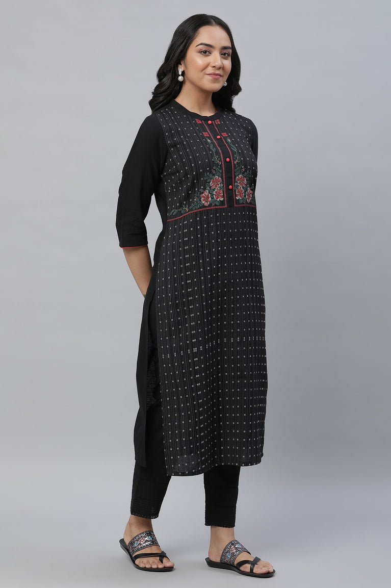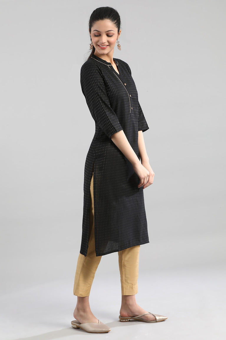 A perfect pick for your casual and workwear wardrobe. This black textured straight silhouette kurta has square neck and three-quarter sleeves.