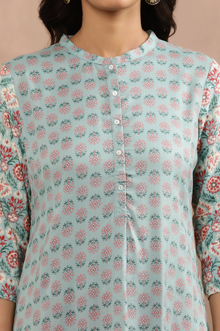 Blue Button Down Printed Kurta And Tights Set