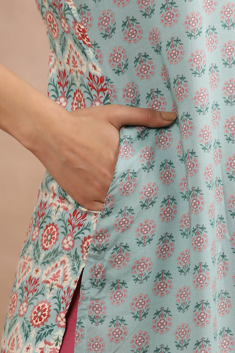 Add a touch of timeless grace to your wardrobe with this beautiful straight kurta for women crafted in natural cambric fabric. Featuring an all-over floral print in subtle earthy tones on a soothing pastel blue base, this kurta is a perfect blend of comfort and style. The soft texture and lightweight weave of cotton make it ideal for casual outings, summer get-togethers, and daytime festivities. Thoughtfully designed with 3/4th sleeves, a v neckline with embroidered detailing, this kurta brings effortless charm to your everyday ethnic collection.