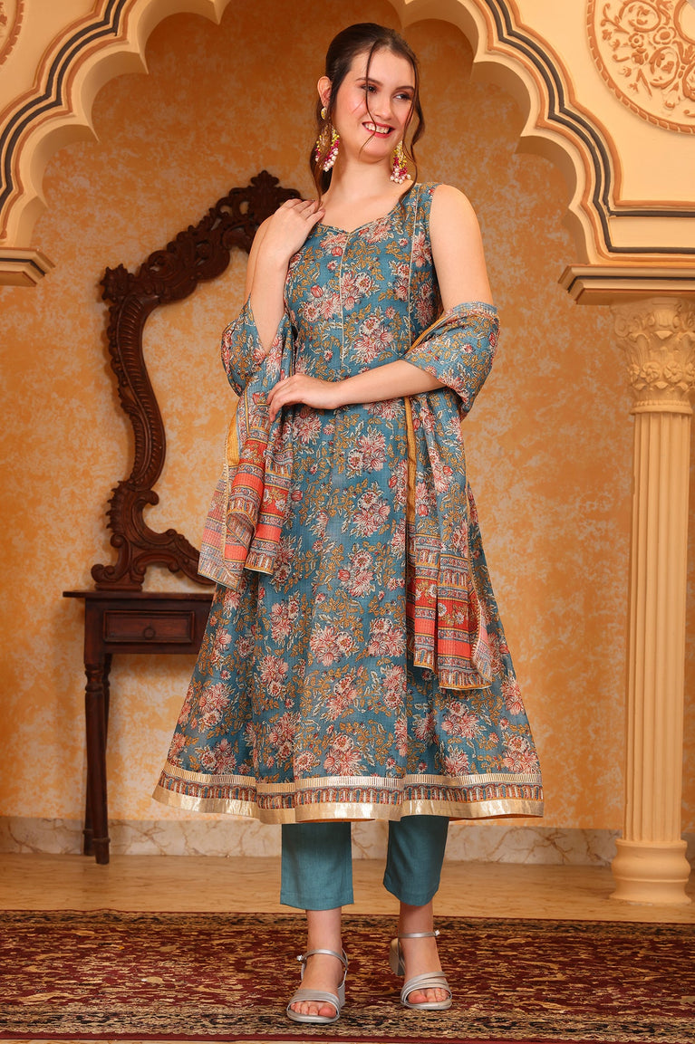 Blue Botanical Printed Tape Embroidered Anarkali Kurta, Trouser and Dupatta Set