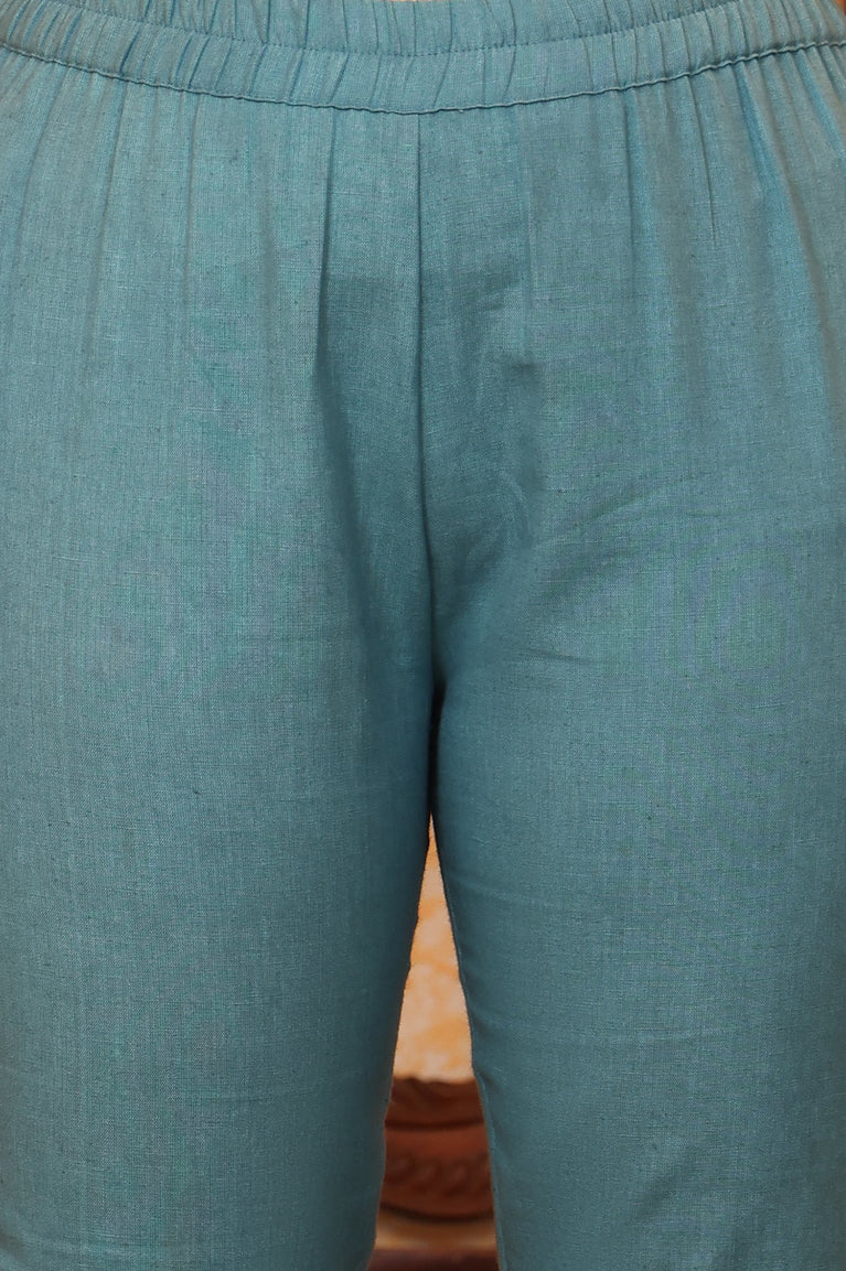 Looking for a perfect pair of bottom to add in your light festive looks? Then this pair of blue chambray slim pants are here to elevate your look. This solid straight silhouette pants in mid-rise waist has metallic embroidery and side zip with button closure.