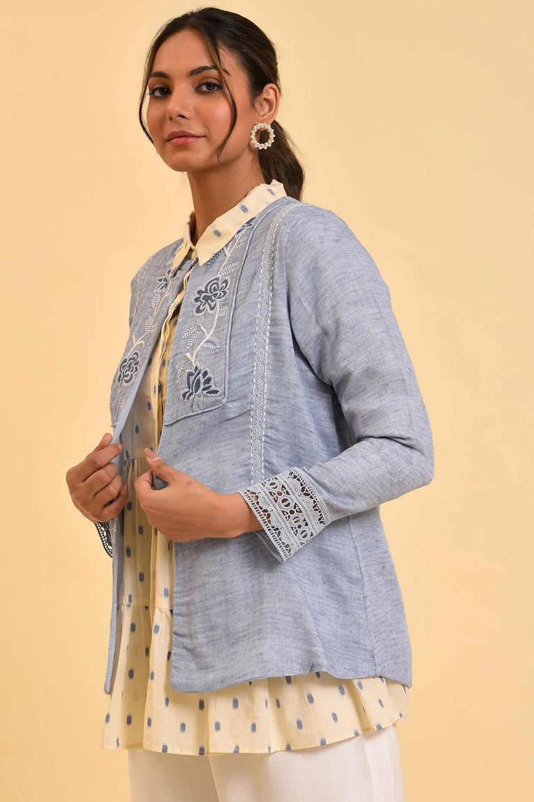 Look Effortlessly Stylish In This Western Jacket For Woman By W. This Cotton Flax Jacket Has Open Front With Single Button Clouser On Neckline. It Is Embellished With Thread Embroidery And Lace Detailing On Sleeves' Hem.