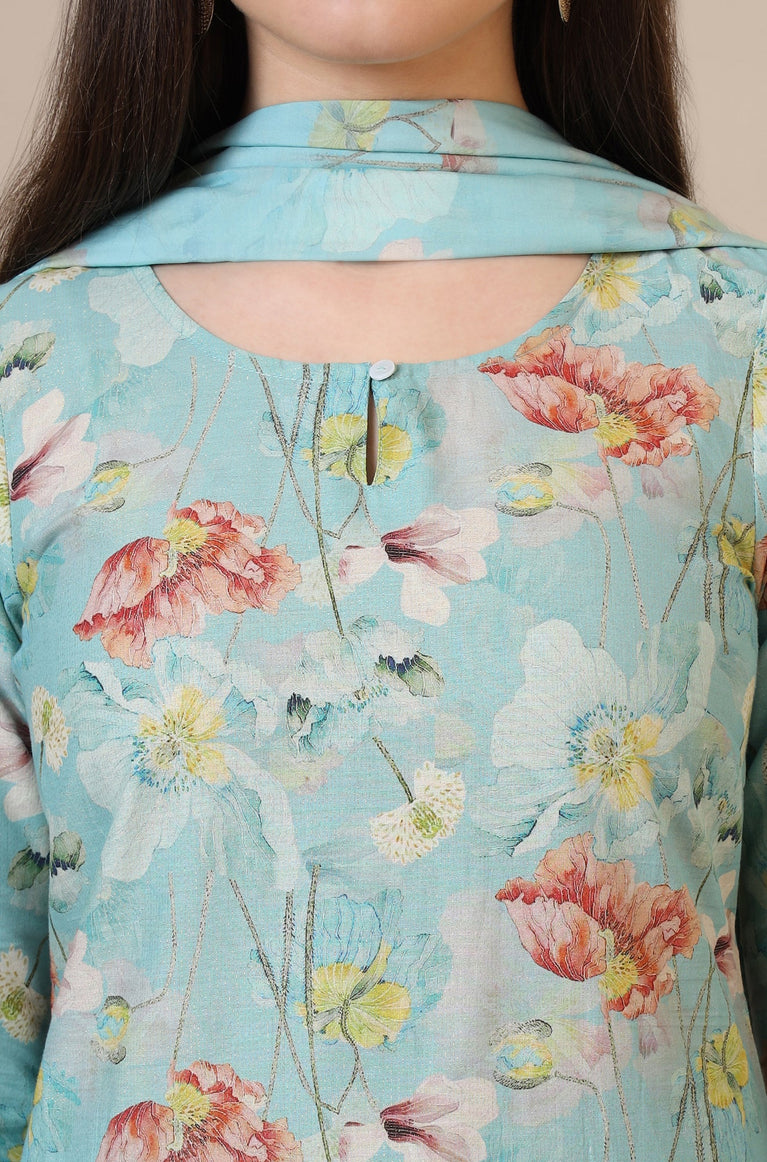 Blue Floral Printed Cotton Blend Straight Kurta, Palazzos and Dupatta Set
