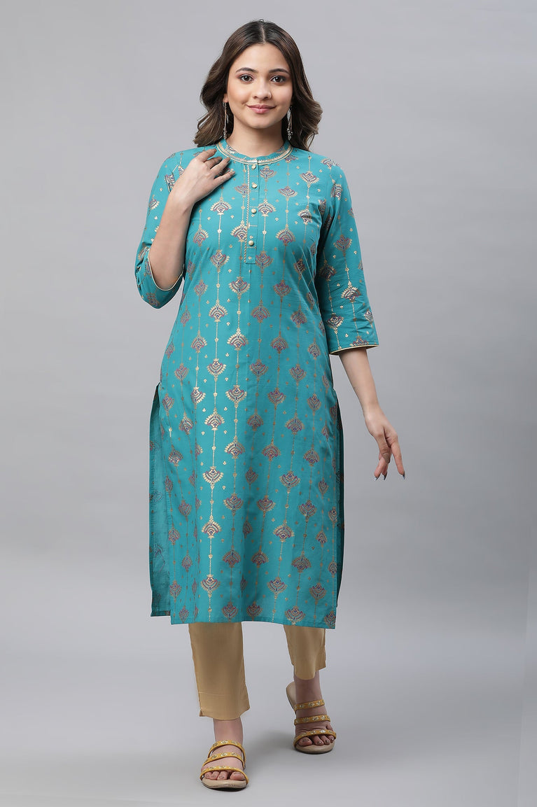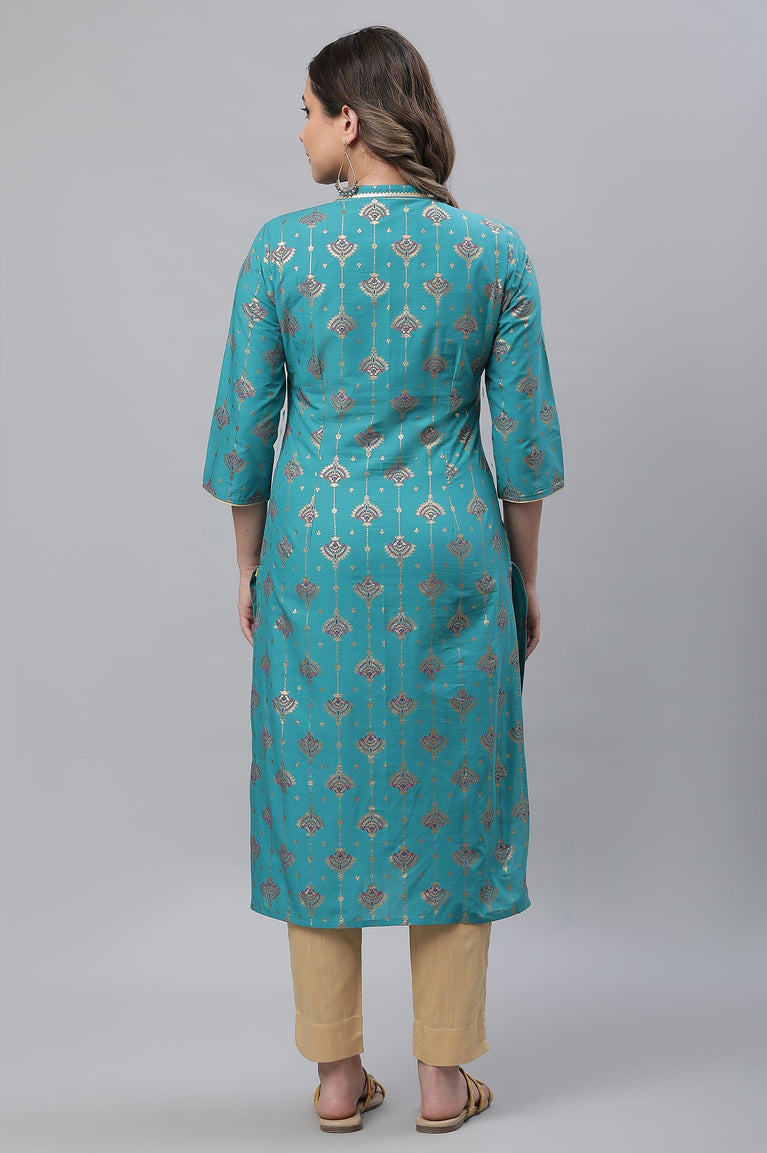 Peacock blue foil print kurta in mandarin neck and three fourth sleeves. It features concealed button placket and side slits.